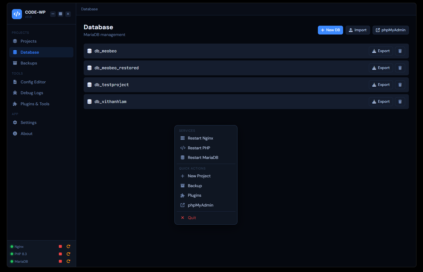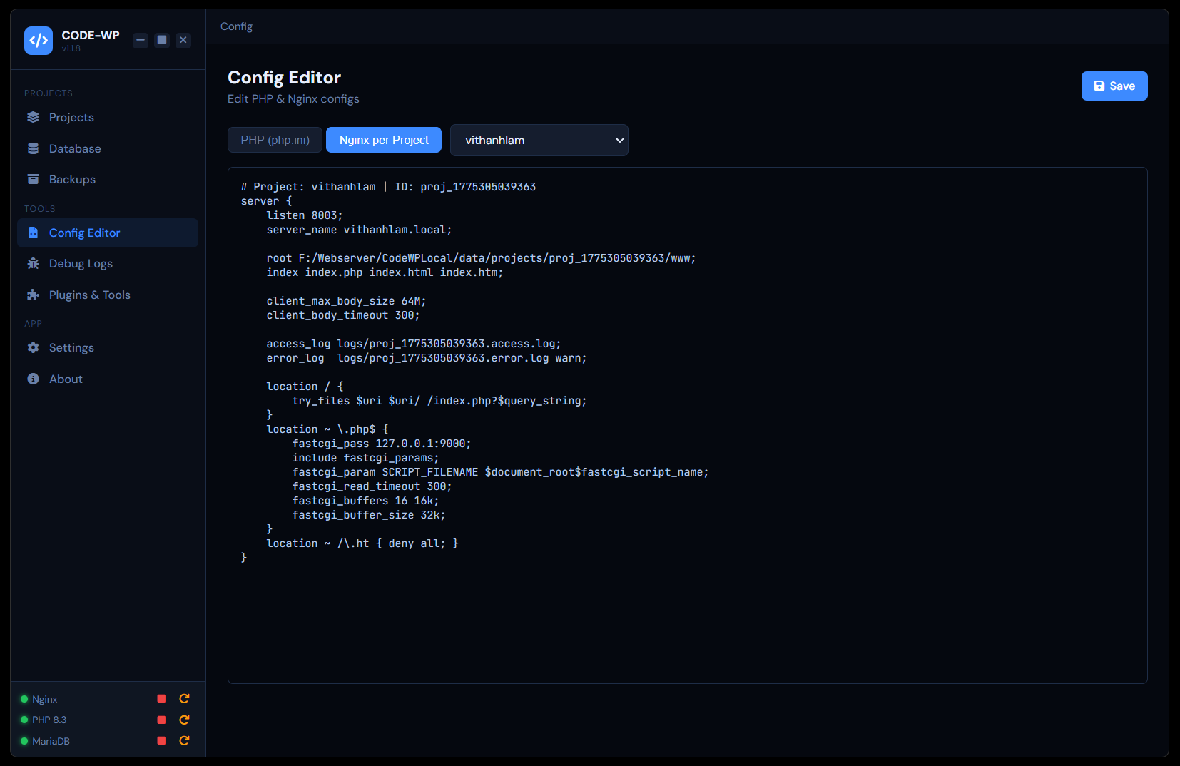 Phần mềm tích hợp sẵn Nginx, MariaDB và PHP-CGI, tự động cấu hình domain local, database và server cho từng project. Nhờ đó, developer có thể tập trung vào code thay vì xử lý môi trường phức tạp, đồng thời dễ dàng quản lý, backup và debug dự án ngay trên một giao diện duy nhất