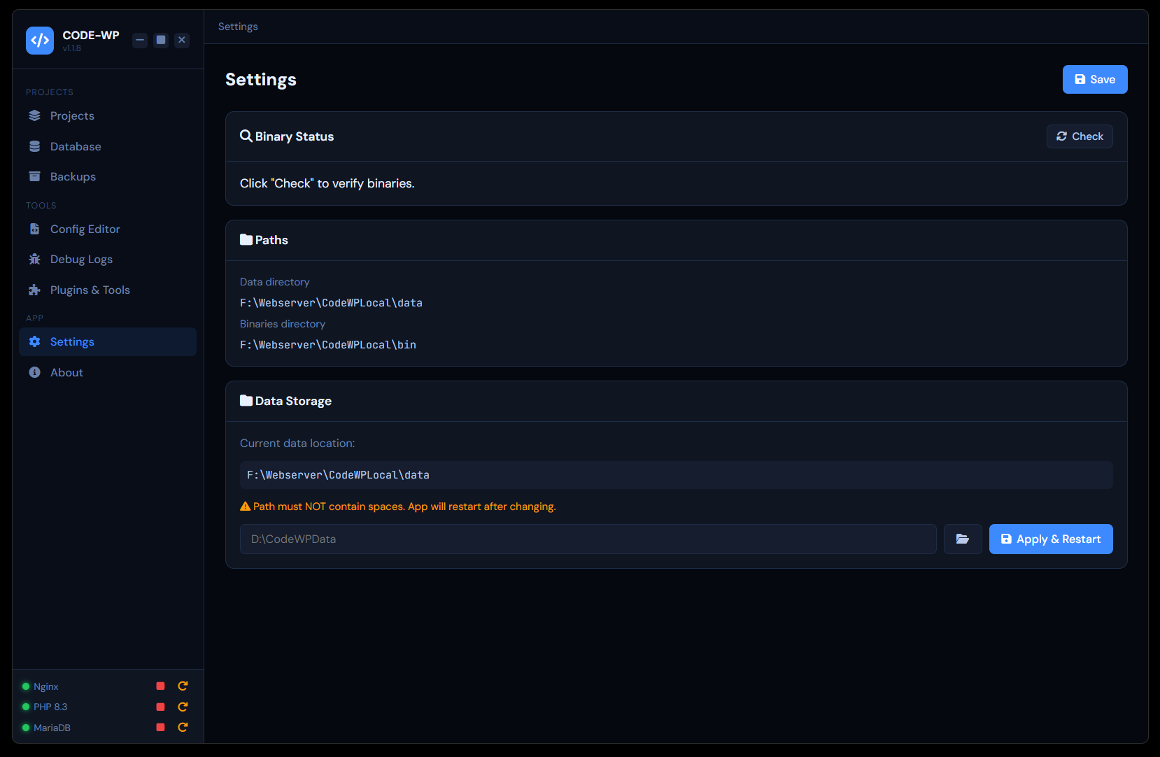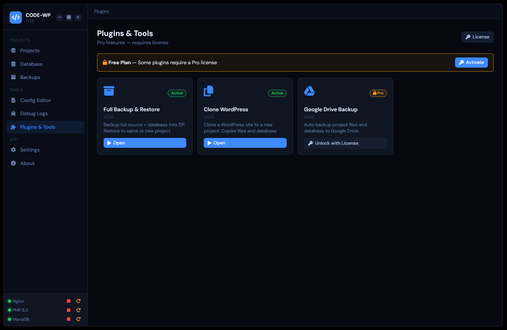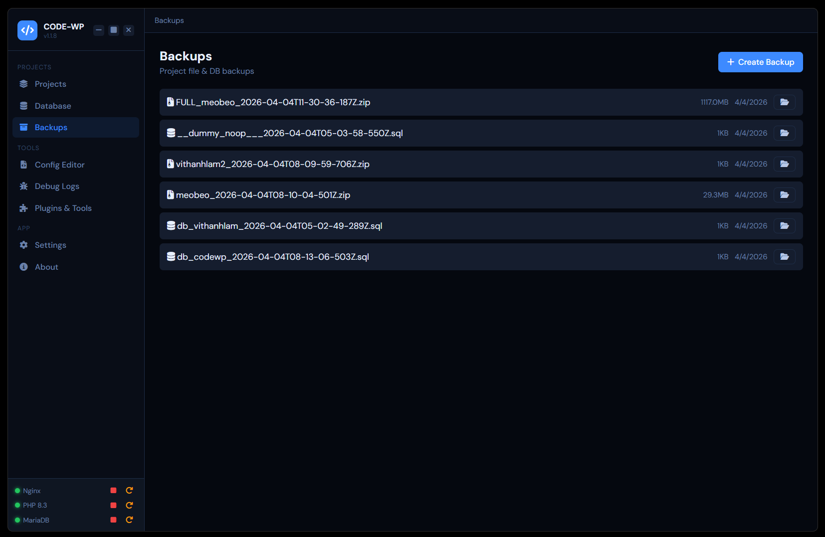 CODE-WP Local là phần mềm chạy trên Windows giúp tạo và quản lý môi trường phát triển local cho WordPress và các ứng dụng PHP một cách nhanh chóng, gọn nhẹ. Hệ thống được xây dựng tối ưu hiệu năng, giúp khởi tạo project, chạy server và truy cập website chỉ trong vài thao tác.